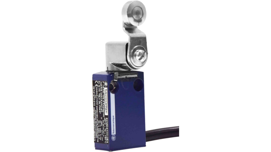 Interruttore di fine corsa con attuatore a rullo, configurazione 2NA e 2NC, corrente massima 6A, protezione IP66 e IP67, custodia in metallo, azione rapida. Conforme alla norma IEC 60947-5-1, elevata precisione di ripetitività, alta resistenza alle condizioni ambientali industriali. Certificazioni UL, CSA, CCC. Codice costruttore: XCMD4116L5EX, marchio: Telemecanique Sensors.