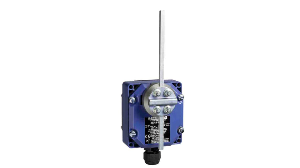 Interruttore di fine corsa con configurazione 1NC/1NO + 1NC/1NO, tensione massima 500V, corrente massima 3A, grado di protezione IP65, azione rapida, custodia in metallo, testa rotante, asta quadrata in metallo a leva con aste incrociate e ritenuta da 6 mm, privo di mercurio. Marchio Telemecanique Sensors, codice costruttore XCRE181EX.