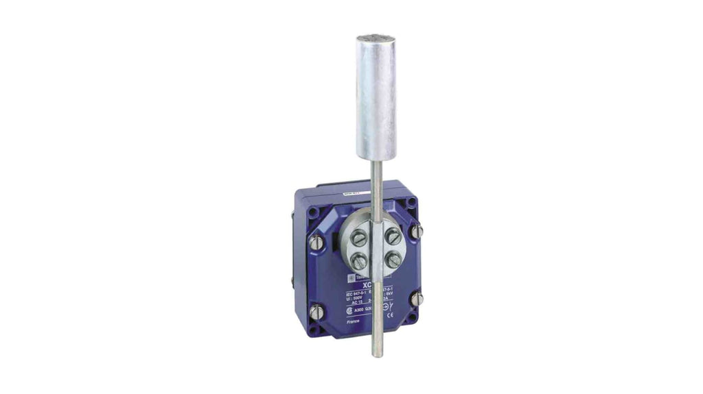 Interruttore di fine corsa con leva a rullo, 2CO, 240V, 3A, protezione IP65. Contenitore in lega di zinco, rotella in acciaio inox, azione rapida. Dimensioni 85mm x 75mm x 95mm, temperatura operativa da -25°C a +70°C, forza di azionamento 1 Nm, durata meccanica 300000 cicli, tipo di connessione PG13.5. Marchio Telemecanique Sensors, serie XCR. Codice costruttore XCRT215.