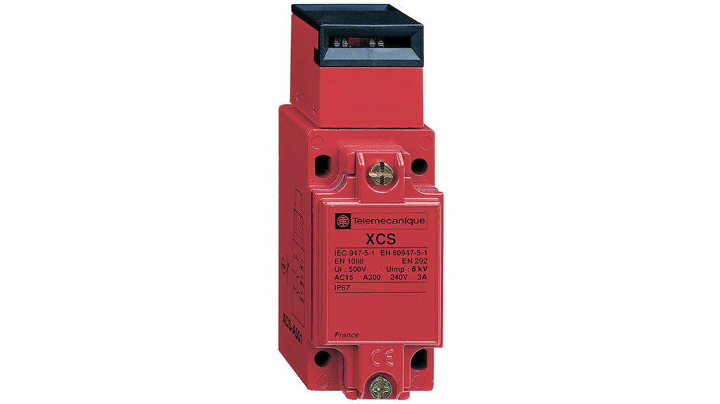 Interruttore di interblocco di sicurezza a chiave, 2NA/1NC, 240V, 6A, grado di protezione IP67, custodia in lega di zinco, stile DIN in metallo, 8 direzioni della testa, forza di azionamento minima 20 N, temperatura operativa da -25°C a +70°C, conforme a EN1088, EN60204. Attuatori da ordinare separatamente. Codice costruttore: XCSA503.