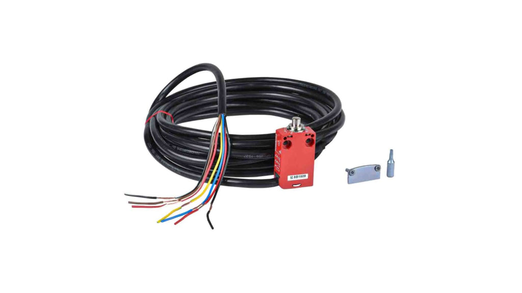 Interruttore di interblocco di sicurezza, attuatore a stantuffo, configurazione 2NA e 2NC, protezione IP66, IP67, IP68, custodia in lega di zinco zamak, cavo di connessione di 5 metri, durata meccanica 10 milioni di cicli, dimensioni 30mm x 60mm x 16mm, serie XCSM. Codice costruttore XCSM4110L5.