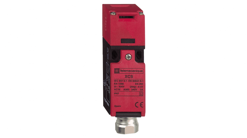 Interruttore di interblocco di sicurezza a chiave Telemecanique Sensors XCS, 1NC/1NA, tensione massima 500V, connessione 1/2 in NPT, custodia in plastica, durata meccanica 1000000 cicli, isolamento a doppio isolamento, tipo di bloccaggio interblocco, progettato per applicazioni industriali.