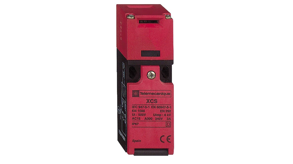 Interruttore di interblocco di sicurezza a chiave, 2NA/1NC, serie XCSPA, protezione IP67, tensione massima 240V, corrente massima 6A, attuatore non incluso, testa ruotabile con 8 posizioni, forza di azionamento minima 15 N, materiale custodia in nylon rinforzato in fibra di vetro, dimensioni 30mm x 30mm x 94mm, temperatura operativa da -25°C a +70°C, conforme a EN1088 e EN60204.