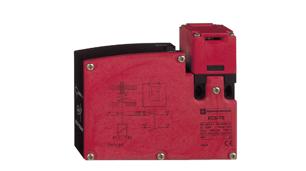 Interruttore di interblocco a solenoide, 2NC, corpo in plastica termoplastica, testa a torretta regolabile, grado di protezione IP67, massima tensione 120V, colore rosso. Progettato per applicazioni industriali in condizioni difficili, garantisce il funzionamento sicuro della macchina con accesso riservato agli operatori autorizzati. Marchio Telemecanique Sensors, codice costruttore XCSTE7331.