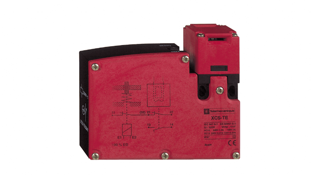 Interruttore di interblocco a solenoide, 2NC, corpo in plastica, massima tensione 230V, grado di protezione IP67, conforme a ISO 13849-1, EN/IEC 61508, categoria 4, livello di prestazioni PL, SIL 3. Progettato per garantire un controllo di arresto della macchina "a porta aperta" in condizioni difficili. Marca: Telemecanique Sensors, codice costruttore XCSTE7342.
