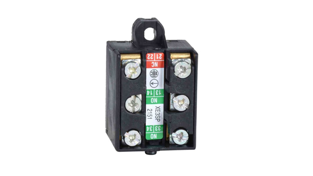 Blocco di contatti interruttore di fine corsa, configurazione 1 NC e 2 NA, 3 poli, serie XE3S, attivazione a scatto, tipo terminale con morsetto a vite. Prodotto di alta affidabilità per applicazioni industriali.