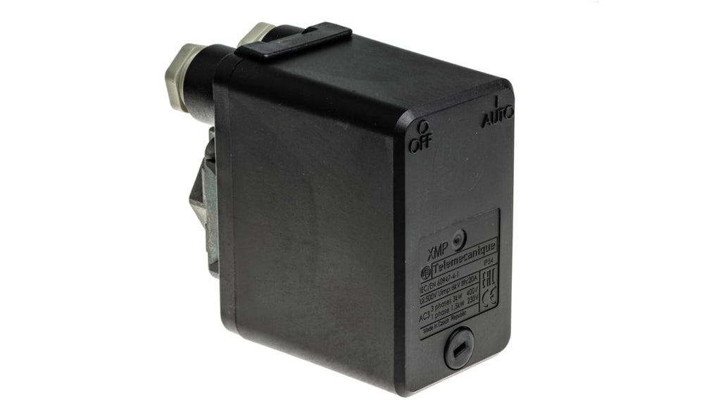 Pressostato differenziale Telemecanique Sensors, 12 bar max, attuatore di pressione a diaframma, differenziale regolabile, precisione inferiore al 3.5%, uscita 2 N/C, collegamento al processo G 1/4, collegamento elettrico a morsetto a vite, custodia in PA impregnato con fibra di vetro, temperatura operativa da -25 a +70 gradi, grado di protezione IP54, per aria, acqua dolce e acqua di mare.