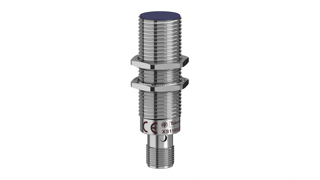 Sensore di prossimità induttivo cilindrico Telemecanique Sensors, PNP, M18 x 1, rilevamento 5 mm, tensione di alimentazione 12-24 V, connettore M12 a 4 pin, grado di protezione IP67, montaggio incastrato, materiale contenitore ottone nichelato, uscita discreta 1 NC, LED di stato giallo, lunghezza 64 mm.