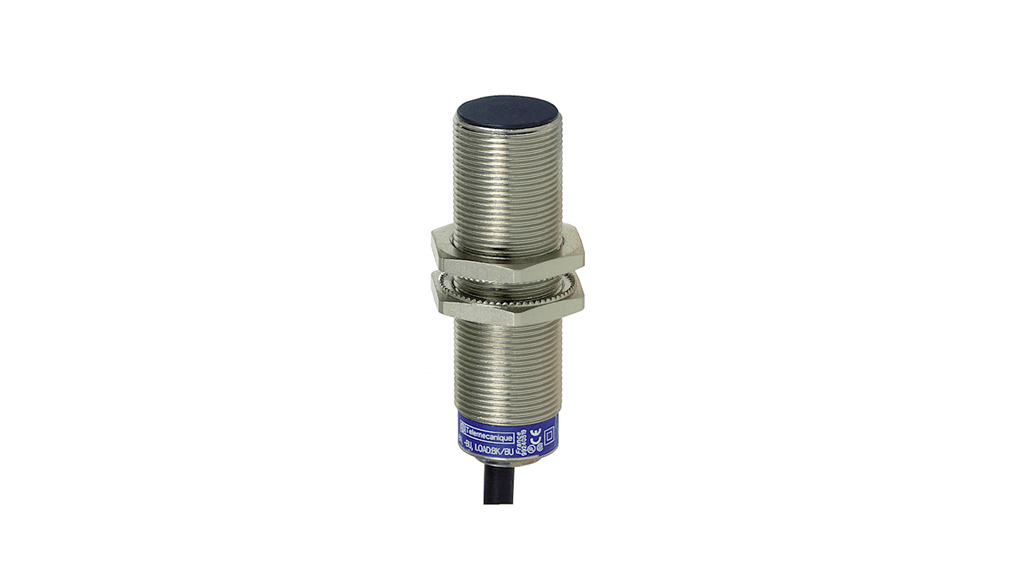 Sensore di prossimità induttivo cilindrico, M18 x 1, rilevamento 5 mm, uscita discreta NC, montaggio a filo, materiale metallico, cavo di collegamento 2 m, tensione di alimentazione 24240 V, grado di protezione IP68, dimensioni 60 mm. Prodotto da Telemecanique Sensors, codice costruttore XS1M18MB250.