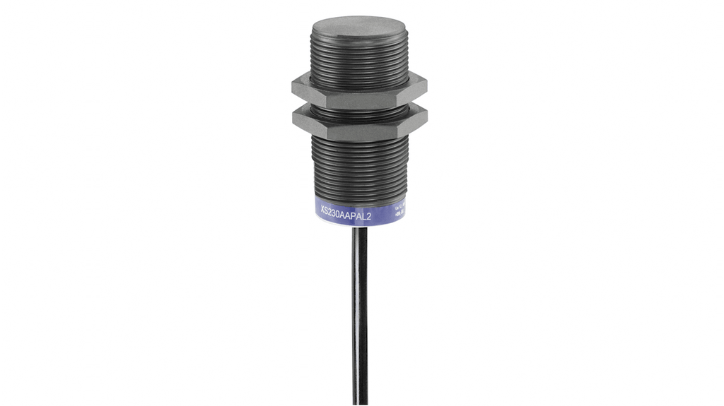 Sensore di prossimità induttivo cilindrico, M30 x 1.5, rilevamento 22 mm, uscita discreta normalmente aperta, tensione di alimentazione 24240 V, grado di protezione IP68 e IP69K, montaggio a filo, lunghezza 60 mm, cavo di collegamento 10 m, materiale plastico, applicazione in alimenti e bevande, segmento farmaceutico. Codice costruttore XS230AAMAL10, marchio Telemecanique Sensors.