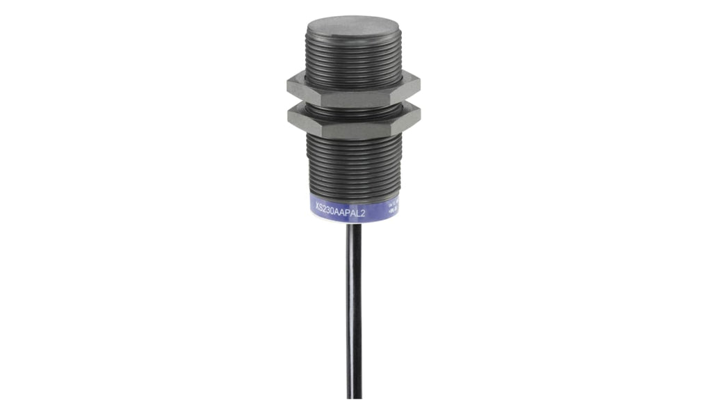 Sensore di prossimità induttivo cilindrico, M30 x 1.5, rilevamento fino a 22 mm, tensione di alimentazione 20-264 V c.a./c.c., grado di protezione IP69K, temperatura operativa da -25°C a +85°C, corrente di commutazione 200 mA, 300 mA, materiale custodia in PPS, montaggio non a filo, frequenza di commutazione massima 300 Hz. Codice costruttore XS230AAMAL2, marchio Telemecanique Sensors.