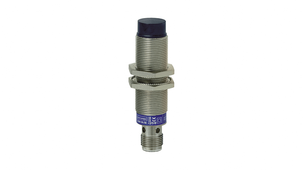 Sensore di prossimità induttivo cilindrico, M18 x 1, rilevamento 8 mm, uscita discreta normalmente aperta, configurazione cablaggio a 2 fili, tensione di alimentazione 24240 V, grado di protezione IP67, connettore maschio 1/2"20 UNF a 3 pin, montaggio a filo, materiale metallico, lunghezza 72 mm. Codice costruttore XS2M18MA250K, marchio Telemecanique Sensors.