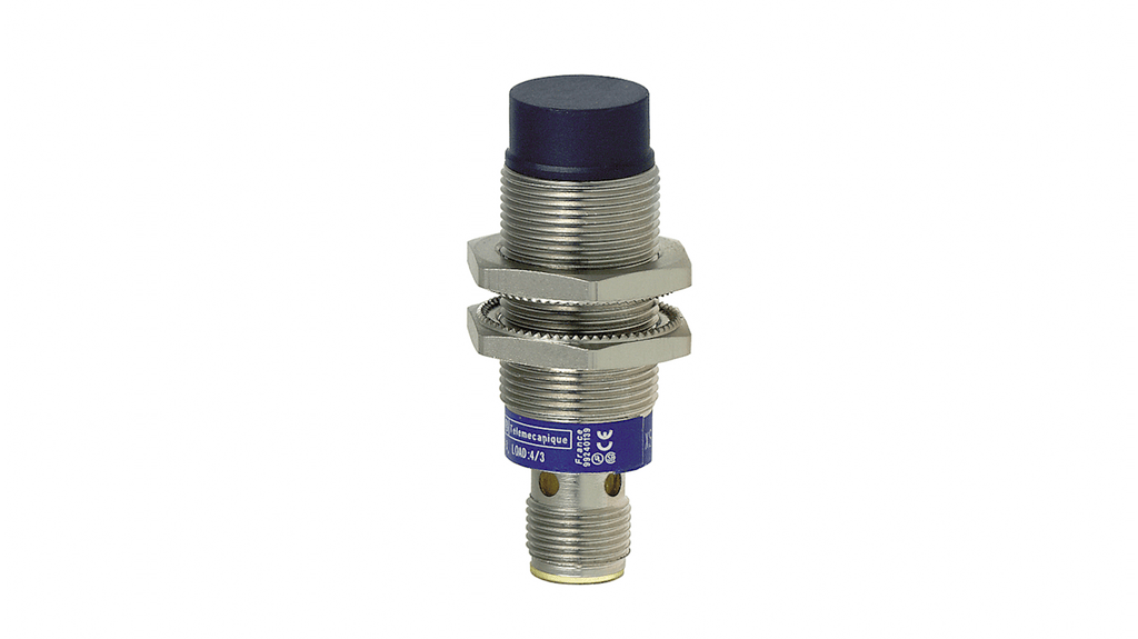Sensore di prossimità induttivo cilindrico, NPN, M18 x 1, rilevamento 8 mm, tensione di alimentazione 12-24 V, uscita discreta 1 NA + 1 NC, connettore M12 a 4 pin, grado di protezione IP67, lunghezza 49 mm, montaggio a filo, materiale metallico. Progettato per il rilevamento di oggetti metallici.