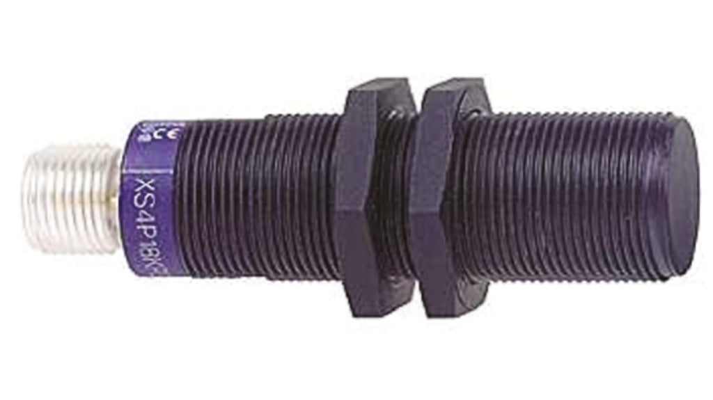 Sensore di prossimità cilindrico induttivo Telemecanique, PNP, M18 x 1, rilevamento 8 mm, tensione di alimentazione 12-48 V c.c., corrente di commutazione 200 mA, grado di protezione IP67, temperatura operativa da -25 a +70 gradi Celsius, connettore M12 a 4 pin, montaggio non a filo, materiale custodia plastica, frequenza di commutazione massima 2 kHz, protezione sovraccarico e corto circuito, protezione da inversione di polarità.