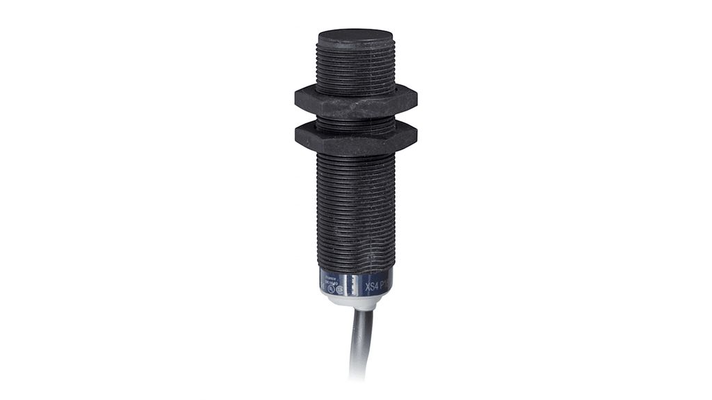 Sensore di prossimità cilindrico induttivo, PNP, M18 x 1, rilevamento 8 mm, tensione di alimentazione 12-48 V, uscita discreta normalmente chiusa, montaggio a filo, grado di protezione IP68, lunghezza cavo 5 m, dimensioni 62 mm. Prodotto da Telemecanique Sensors, codice costruttore XS4P18PB370L1.