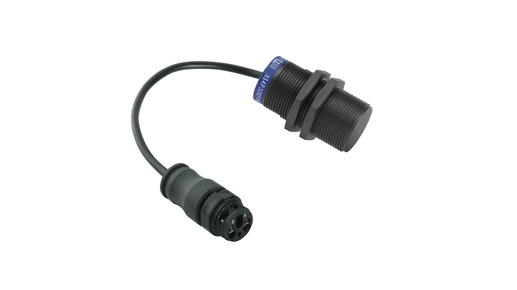 Sensore di prossimità induttivo cilindrico, PNP, M30 x 1.5, rilevamento 15 mm, tensione di alimentazione 12-48 V, uscita discreta normalmente aperta, montaggio a filo, materiale plastico, grado di protezione IP68, lunghezza 62 mm, collegamento elettrico con morsetto a vite, lunghezza cavo 0,15 m. Codice costruttore XS4P30PA370L01B, marchio Telemecanique Sensors.