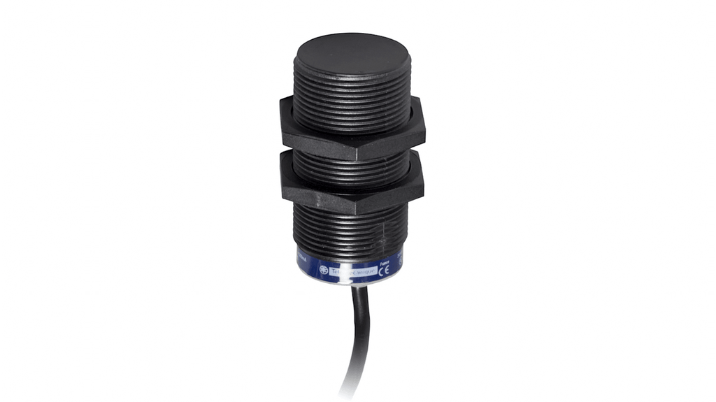 Sensore di prossimità induttivo cilindrico, PNP, M30 x 1.5, rilevamento 15 mm, tensione di alimentazione 12-24 V, uscita discreta normalmente chiusa, montaggio a filo, materiale plastico, grado di protezione IP68, lunghezza cavo 2 m, dimensioni 43 mm. Codice costruttore XS4P30PB340, marchio Telemecanique Sensors.