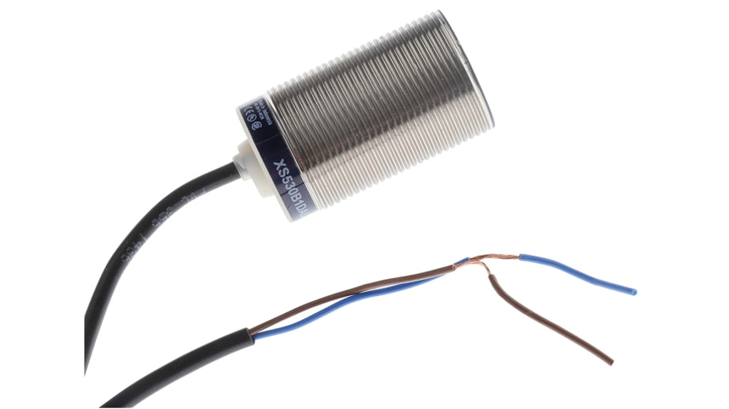 Sensore induttivo cilindrico, M30 x 1.5, rilevamento 10 mm, alimentazione da 12 a 48 V c.c., corrente di commutazione 100 mA, frequenza di commutazione massima 1.3 kHz, temperatura operativa da -25 a +70 gradi Celsius, grado di protezione IP65 e IP68, montaggio a filo, custodia in ottone nichelato, protezione da inversione di polarità e sovraccarico. Codice costruttore XS530B1DAL2, marchio Telemecanique Sensors.