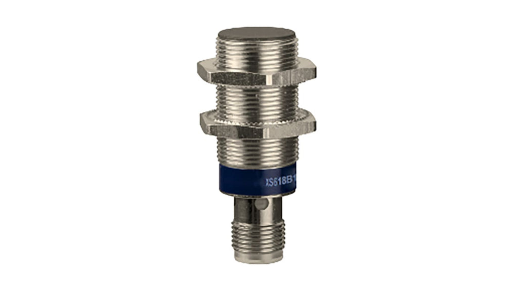 Sensore di prossimità induttivo cilindrico, M18 x 1, rilevamento 8 mm, tensione di alimentazione 12-48 V c.c., connettore M12 a 4 pin, grado di protezione IP67 e IP69K, corrente di commutazione 100 mA, temperatura operativa da -25 a +70 gradi Celsius, materiale custodia in ottone e PPS, frequenza di commutazione massima 2 kHz, protezione da inversione di polarità e sovraccarico. Codice costruttore XS618B1DAM12.