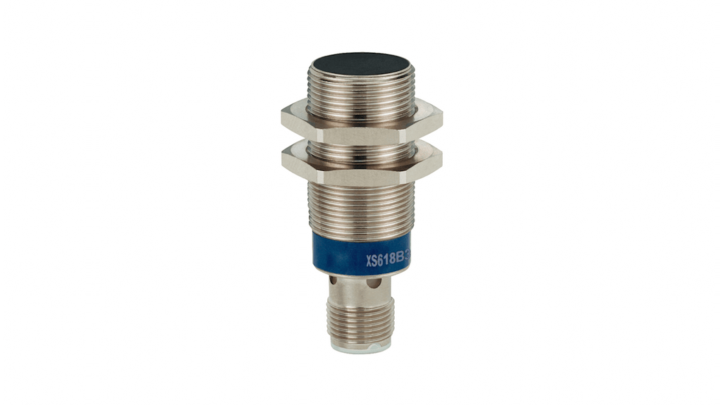 Sensore di prossimità induttivo cilindrico, M18 x 1, rilevamento 8 mm, tensione di alimentazione 12-24 V c.c., uscita discreta normalmente aperta, connettore M12 a 4 pin, grado di protezione IP67 e IP69K, capacità di commutazione fino a 100 mA, montaggio a filo, materiale metallico, lunghezza 50 mm. Codice costruttore XS618B3DAM12, marchio Telemecanique Sensors.