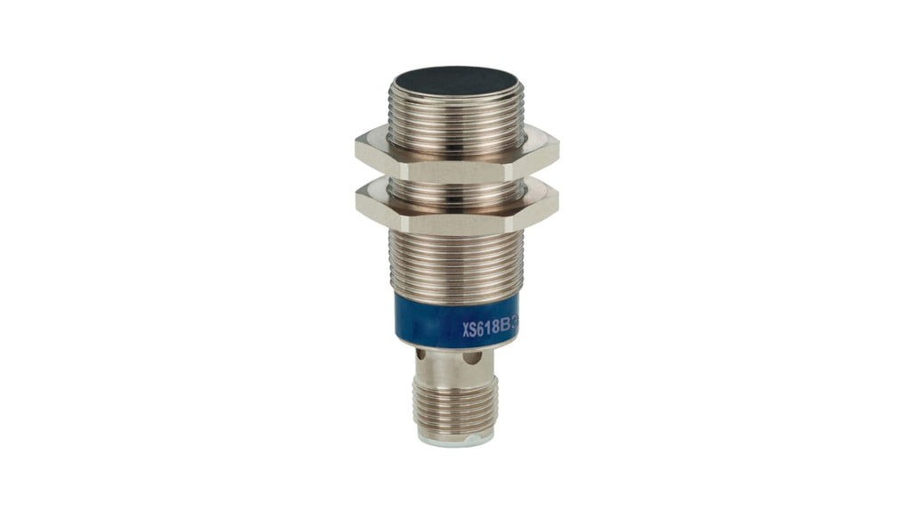 Sensore induttivo cilindrico M18, rilevamento 8 mm, tensione di alimentazione 10-36 V c.c. e 12-24 V c.c., con connettore M12 a 4 pin. Grado di protezione IP67 e IP69K, temperatura operativa da -25°C a +70°C, corrente di commutazione 100 mA, frequenza di commutazione massima 1 kHz. Materiale custodia in ottone nichelato e PPS, conforme a standard CE, CSA, UL. Codice costruttore XS618B3DBM12.