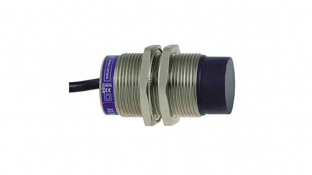 Sensore di prossimità induttivo cilindrico, diametro 30 mm, montaggio a filo, tecnologia PNP, gamma di rilevamento 15-40 mm, contenitore in ottone nichelato, cavo lungo 2 m, placcatura resistente alla corrosione e agli urti, oscillatore ad avvolgimento facciale di rilevamento, dimensione filetto M30 x 1.5.