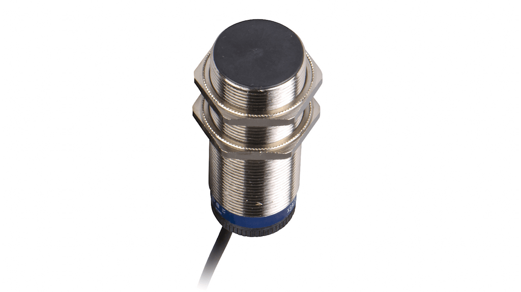 Sensore di prossimità cilindrico, M30 x 1.5, induttivo, uscita discreta 1 NC, gamma di rilevamento 10 mm, tensione di alimentazione 24240 V, grado di protezione IP67, montaggio a filo, corpo in metallo, contenitore in ottone nichelato, lunghezza 81 mm, cavo di collegamento elettrico di 5 m. Codice costruttore XSAV11801L05, marchio Telemecanique Sensors.