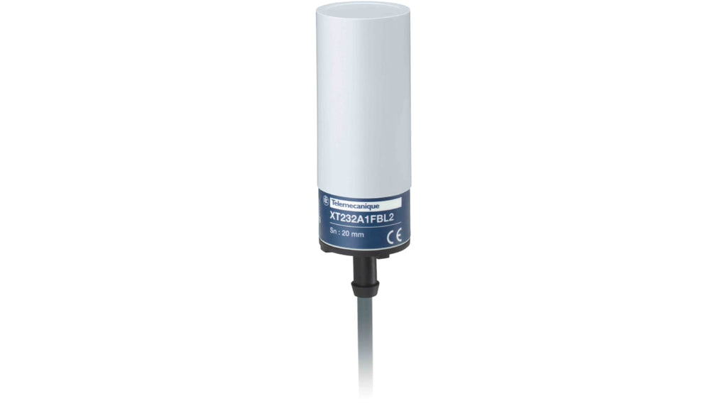 Sensore di prossimità cilindrico capacitivo. Rilevamento di materiali isolati o conduttivi fino a 20 mm. Tensione di alimentazione 240 V, uscita 1 NA, grado di protezione IP67. Contenitore in plastica, diametro 32 mm, lunghezza 80 mm, collegamento precablato di 2 m. Indicazione stato uscita tramite LED giallo. Privo di mercurio, materiale di isolamento filo in PVC. Codice costruttore XT232A1FAL2, marchio Telemecanique Sensors.