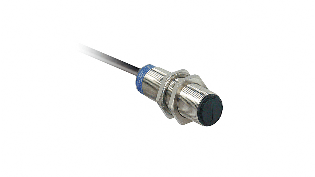 Sensore fotoelettrico miniaturizzato filettato, rilevamento a fascio diretto fino a 15 m, uscita discreta 1 NC, alimentazione c.a./c.c., cablaggio a 2 fili, materiale metallico, lunghezza cavo 2 m, emissione a infrarossi. Serie XU, progettato per applicazioni in manipolazione, imballaggio, etichettatura e industria alimentare.
