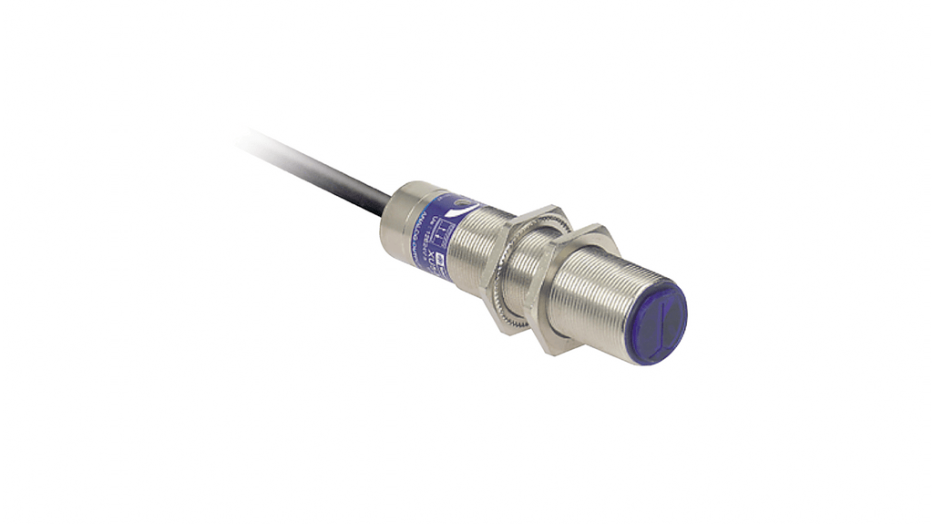 Sensore fotoelettrico miniaturizzato filettato, rilevamento diffuso con soppressione dello sfondo, gamma di rilevamento 2 m, uscita discreta 1 NC, alimentazione c.a./c.c., cablaggio a 2 fili, materiale metallico, linea di veduta assiale, serie XU.