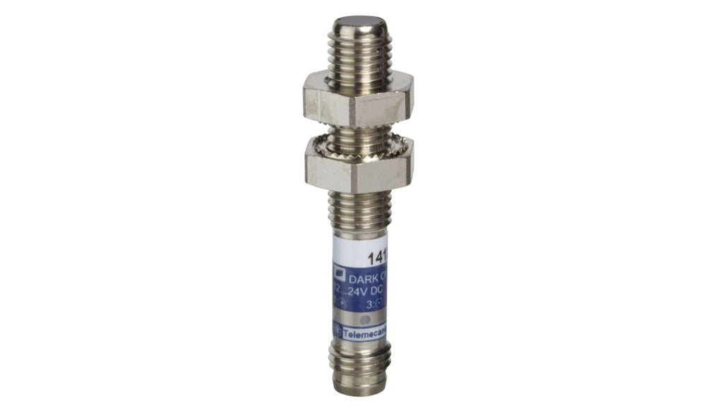 Sensore fotoelettrico cilindrico a diffusione, rilevamento 50 mm, uscita PNP, alimentazione 12-24 V, collegamento elettrico con connettore maschio M8, grado di protezione IP67 e IP65 conforme a IEC 60529, emissione a infrarossi, serie XUA.