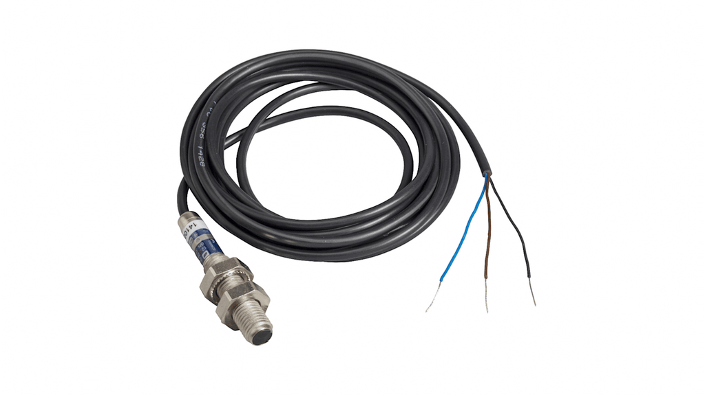 Sensore fotoelettrico miniaturizzato filettato, rilevamento a diffusione, distanza di rilevamento 50 mm, uscita NPN, alimentazione CC, cablaggio a 3 fili, lunghezza cavo 2 m, materiale metallico, linea di veduta assiale, serie XU. Utilizzato in applicazioni di manipolazione, imballaggio, etichettatura e industria alimentare.