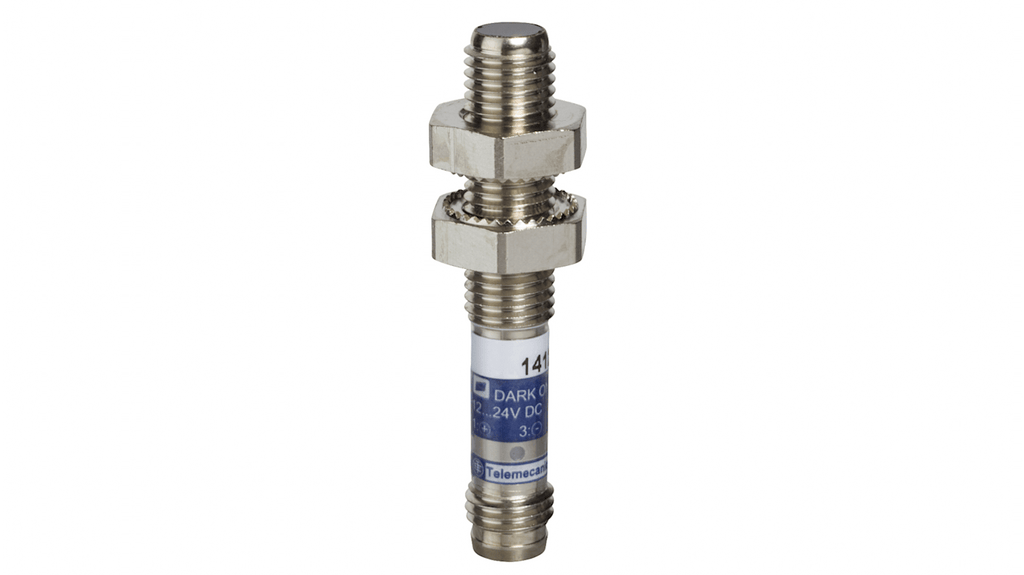 Sensore fotoelettrico miniaturizzato filettato, rilevamento a diffusione, distanza di rilevamento 50 mm, uscita NPN, connettore a 3 pin M8, materiale metallico, linea di veduta assiale, circuito di alimentazione in corrente continua, serie XU. Utilizzato in applicazioni di manipolazione, imballaggio, etichettatura e nell'industria alimentare.