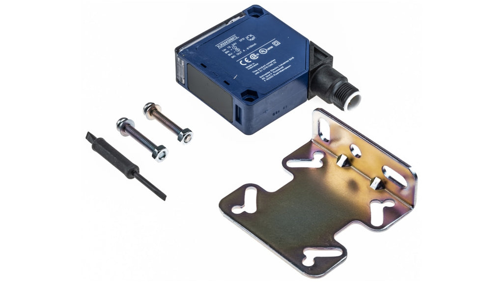 Sensore fotoelettrico compatto, tipo di rilevamento diffuso, gamma di rilevamento 1 m, uscita NPN/PNP, connettore a 4 pin M12, tensione massima 24V, sorgente di luce infrarossi, grado di protezione IP30 e IP65, corrente massima 100 mA, tempo di risposta 2 ms, temperatura operativa da -25°C a +55°C, materiale custodia in PC, staffe di fissaggio incluse.