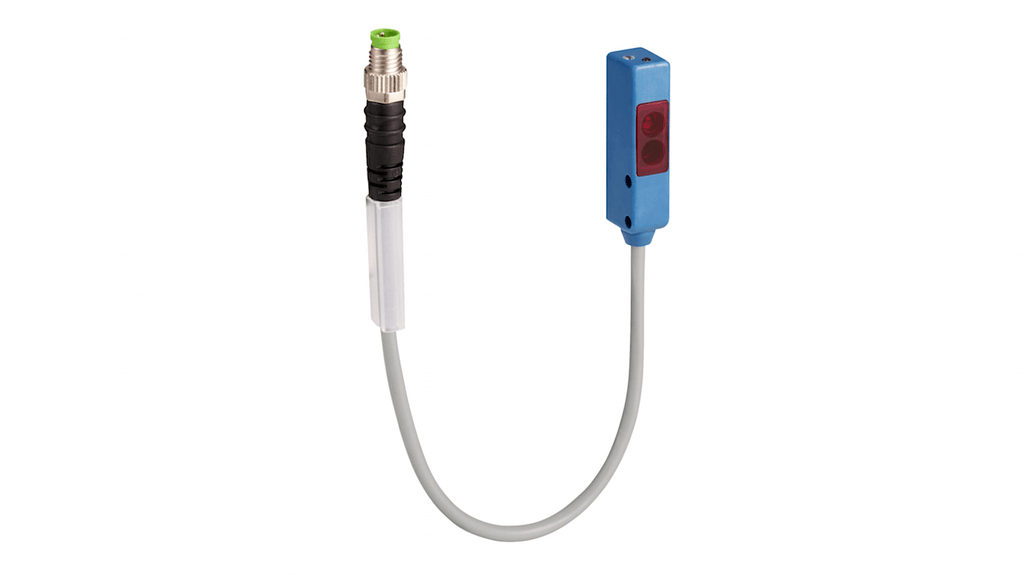 Sensore fotoelettrico miniaturizzato a retroriflessione polarizzata, rilevamento fino a 1 m, tensione operativa da 12 a 24 V c.c., uscita a stato solido, connettore a 4 pin M8, progettato per ambienti aggressivi, serie XUY.