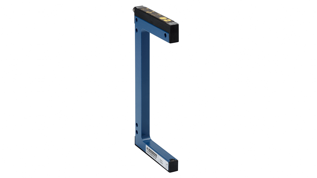 Sensore fotoelettrico a forcella, rilevamento 120 mm, uscita PNP/NPN, con connettore a 4 pin M8. Materiale metallo/plastica, alimentazione CC, funzione di uscita discreta programmabile 1 NA o 1 NC. Applicazioni: rilevamento di fogli doppi, etichette, contrassegni di riferimento, su binari vibranti e trasportatori piccoli. Serie XU, stile sensore forcella, tipo di rilevamento fascio diretto.
