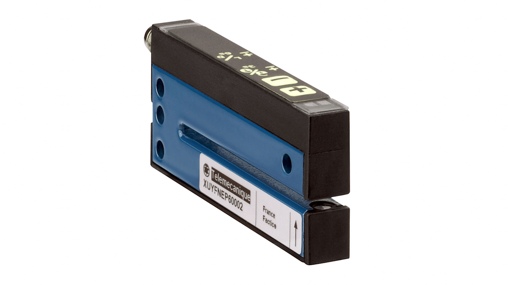 Sensore fotoelettrico a forcella, design a forcella, rilevamento a fascio diretto, gamma di rilevamento 5 mm, uscita PNP/NPN, connettore a 4 pin M8, grado di protezione IP65, privo di mercurio, serie XUY.