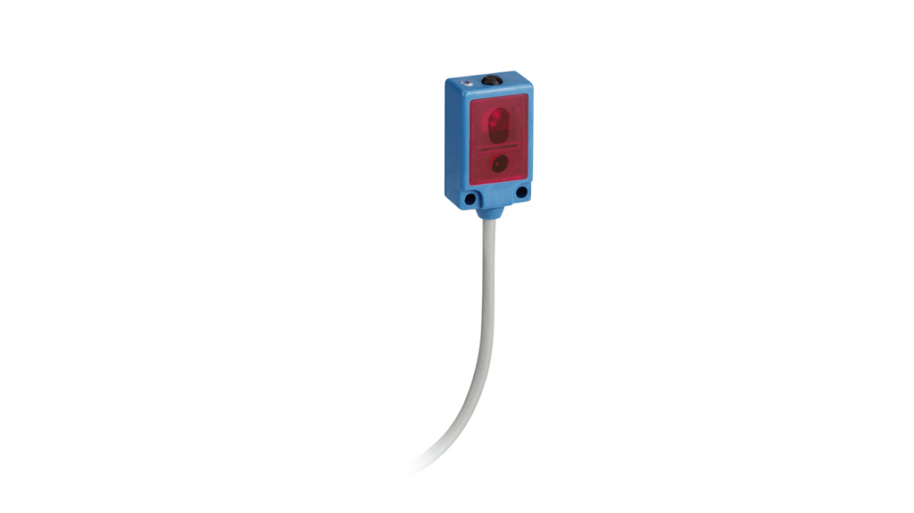 Sensore fotoelettrico miniaturizzato, fascio diretto, rilevamento fino a 4 m, uscita PNP, cavo di 2 m, grado di protezione IP67, materiale plastico, serie XUY. Funzione di uscita separata 1 NA o 1 NC programmabile.