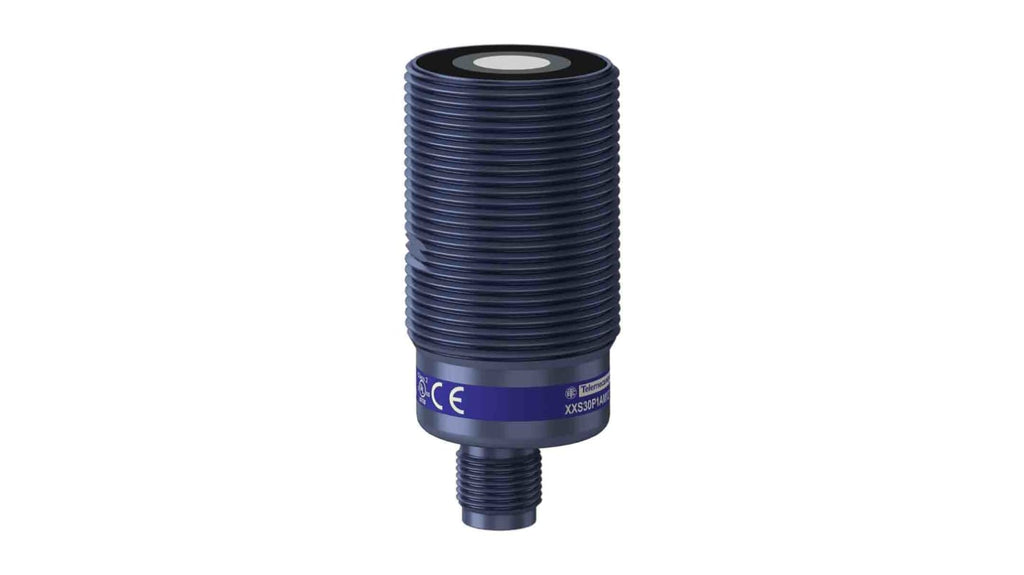 Sensore di prossimità cilindrico a ultrasuoni, M30 x 1.5, distanza di rilevamento 105 a 1000 mm, uscita analogica 4 a 20 mA, alimentazione 10-30 V c.c., connettore maschio M12 a 5 pin, grado di protezione IP65, cablaggio a 5 fili, regolazione della distanza di rilevamento tramite pulsante di apprendimento remoto. Codice costruttore XXS30P1AM12, marchio Telemecanique Sensors.