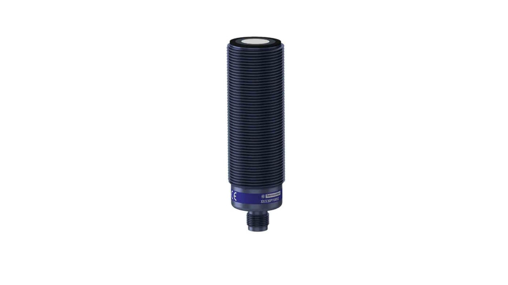 Sensore di prossimità cilindrico a ultrasuoni, M30 x 1.5, uscita analogica 0 a 10 V, distanza di rilevamento 155 a 2000 mm, alimentazione 14-30 V c.c., connettore maschio M12 a 5 pin, cablaggio a 5 fili, grado di protezione IP65. Modello XXS30P2VM12, marchio Telemecanique Sensors.
