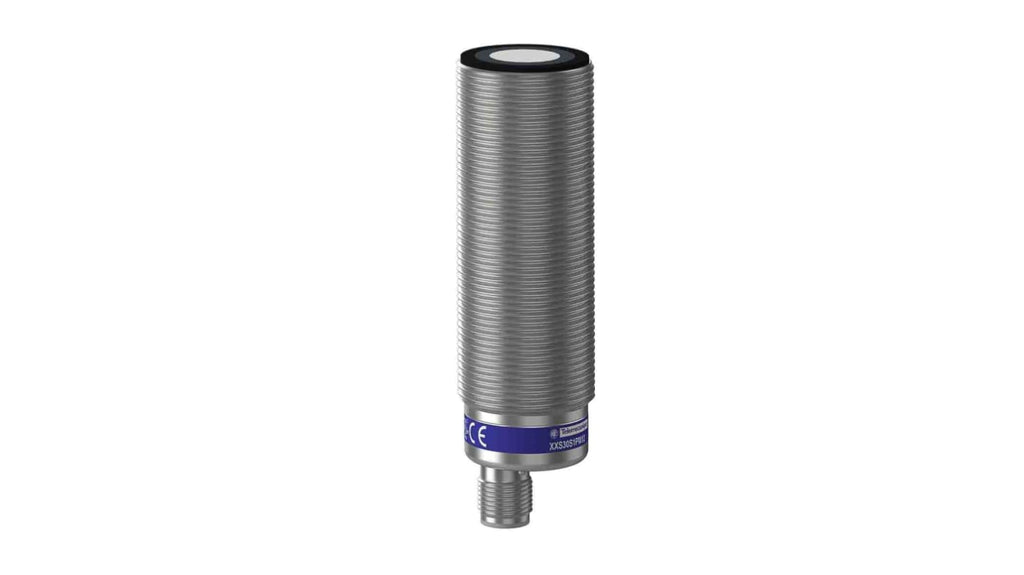 Sensore di prossimità cilindrico a ultrasuoni, M30 x 1.5, PNP, distanza di rilevamento 155 a 1000 mm, cablaggio a 5 fili, connettore maschio M12 a 5 pin, tensione di alimentazione 10-30 V c.c., grado di protezione IP65. Modello XXS30S1PM12, marchio Telemecanique Sensors.