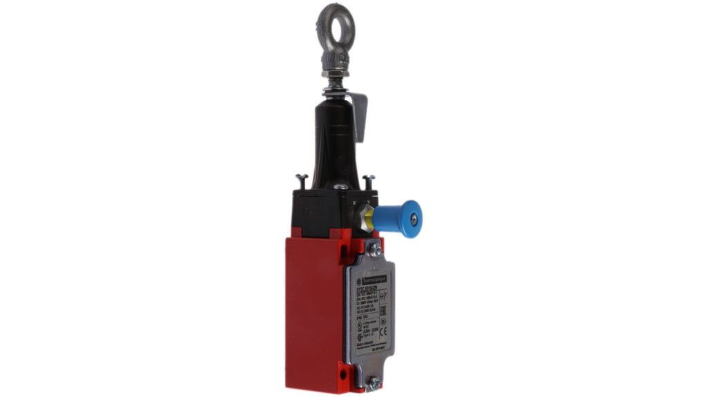 Interruttore a fune per arresto di emergenza Telemecanique Sensors XY2CJ, configurazione contatti NO/NC, lunghezza cavo 20m, montaggio lato destro e sinistro, grado di protezione IP66/IP67, tensione massima 240VAC/250VDC, corrente nominale 3A/270mA, temperatura operativa -25°C/+70°C, dimensioni 200.9 x 64.2 x 40mm, contenitore in Zamak, ingresso cavo filettato ISO M20, approvazioni UL, CCN, CSA, CE.