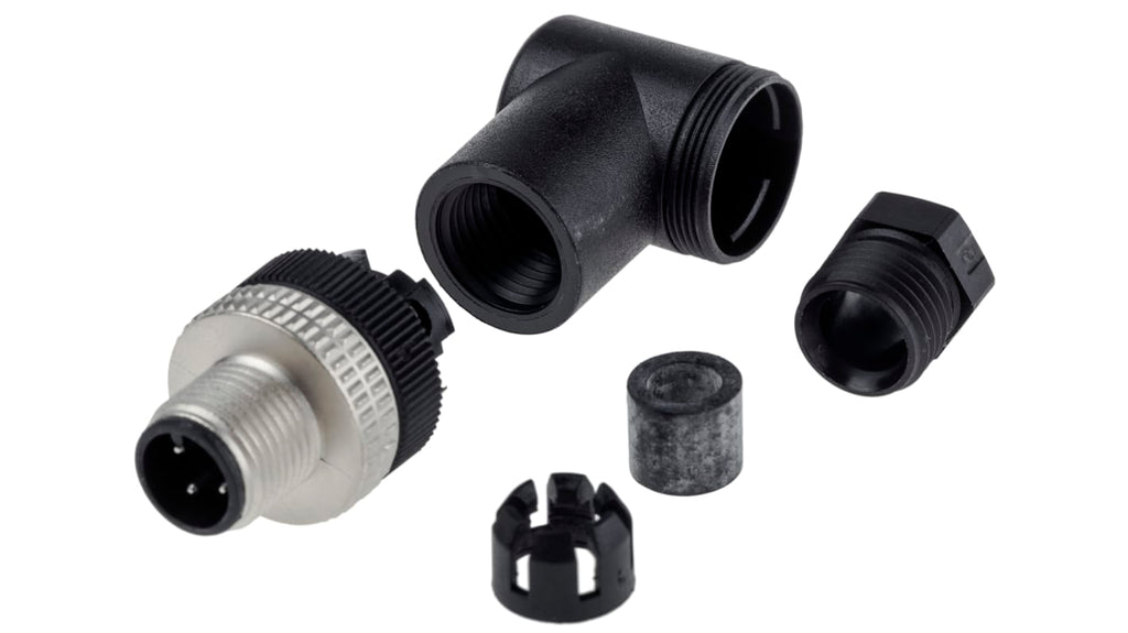 Connettore circolare maschio M12, serie XZCC, 4 poli, montaggio su cavo, terminazione a vite, grado di protezione IP67, orientamento angolo destro, compatibile con connettori femmina M12. Progettato per l'utilizzo con sensori Schneider. Codice costruttore XZCC12MCM40B.