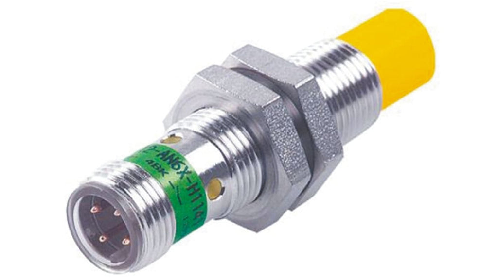 Sensore di prossimità cilindrico induttivo, tecnologia PNP, dimensione filetto M12 x 1, gamma di rilevamento 5 mm, tensione di alimentazione 10-30 V c.c., corrente di commutazione 200 mA, grado di protezione IP67, temperatura operativa da -25 a +70 gradi Celsius, materiale custodia in ottone, frequenza di commutazione massima 2 kHz, protezione da inversione di polarità e sovraccarico. Codice costruttore Ni5-M12-AP6X-H1141, marchio Turck.