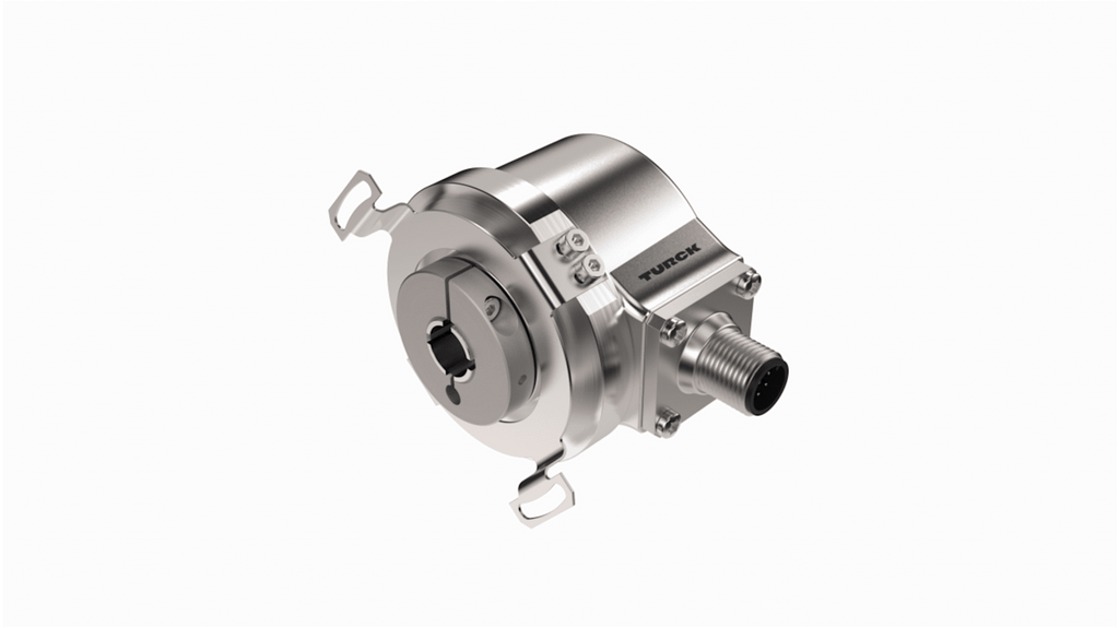 Encoder incrementale Turck, 5000 impulsi per giro, flangia di 63 mm, albero cavo di 12 mm, uscita HTL, tecnologia ottica, grado di protezione IP64, realizzato in acciaio inossidabile, resistenza a vibrazioni e urti, protezione da cortocircuito, frequenza massima degli impulsi 300 kHz, rotazione massima 4500 giri/min, protezione contro rottura fili e inversione di polarità.