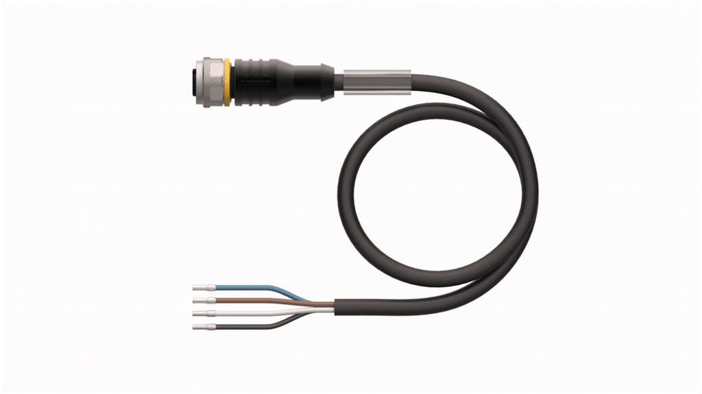Cavo per attuatori e sensori con connettore femmina M12 diritto a 4 pin, lunghezza 2m, giacca in materiale PUR nero, resistente agli agenti chimici, ai raggi UV e agli oli. Classe di protezione IP67 e IP69K, particolarmente resistente all'abrasione, privo di alogeni, silicone e PVC. Resistente alle scintille di saldatura. Modello RKC4.4T-2/TXL.