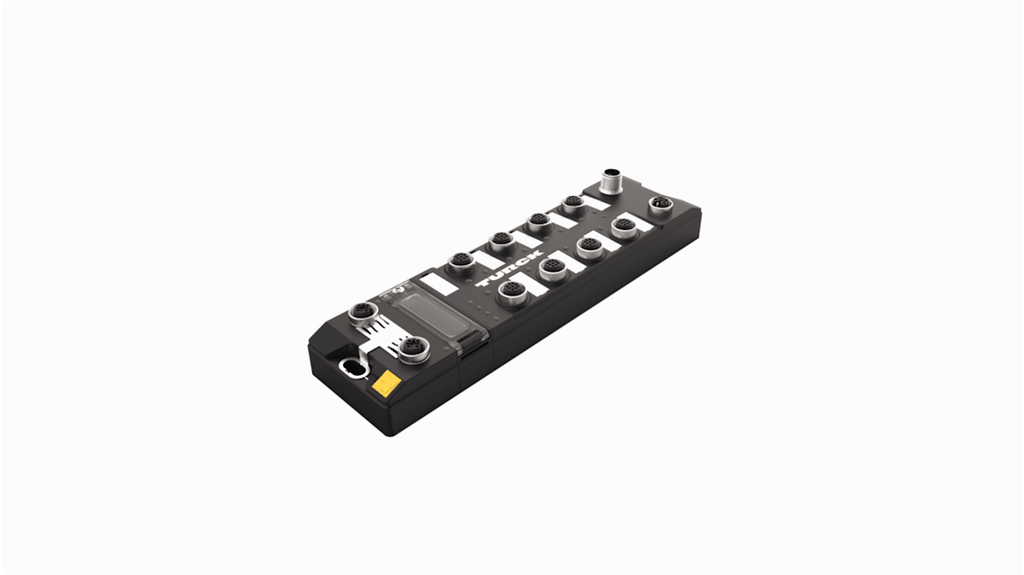 Modulo I/O multiprotocollo compatto per Ethernet, 8 ingressi PNP digitali, 8 uscite PNP digitali, collegamento bus di campo Ethernet con connettori M12, diagnostica di ingresso e uscita, corrente massima per uscita 2 A, velocità di trasmissione 10 Mbps / 100 Mbps, switch Ethernet integrato, contenitore in fibra di vetro, testato per urti e vibrazioni, protezione IP65, IP67, IP69K.