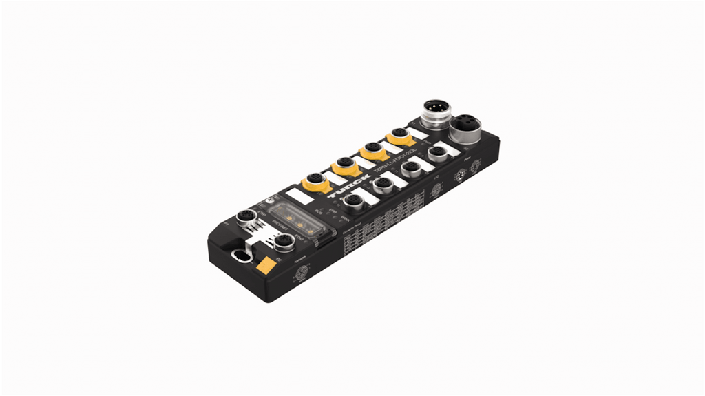 Modulo I/O Turck per applicazioni industriali, contenitore rinforzato in fibra di vetro, due ingressi digitali SIL3 sicuri, switch Ethernet integrato, supporto per 100 Mbps, testato per urti e vibrazioni, elettronica completamente incapsulata, classi di protezione IP65, IP67, IP69K. Serie TBPN.