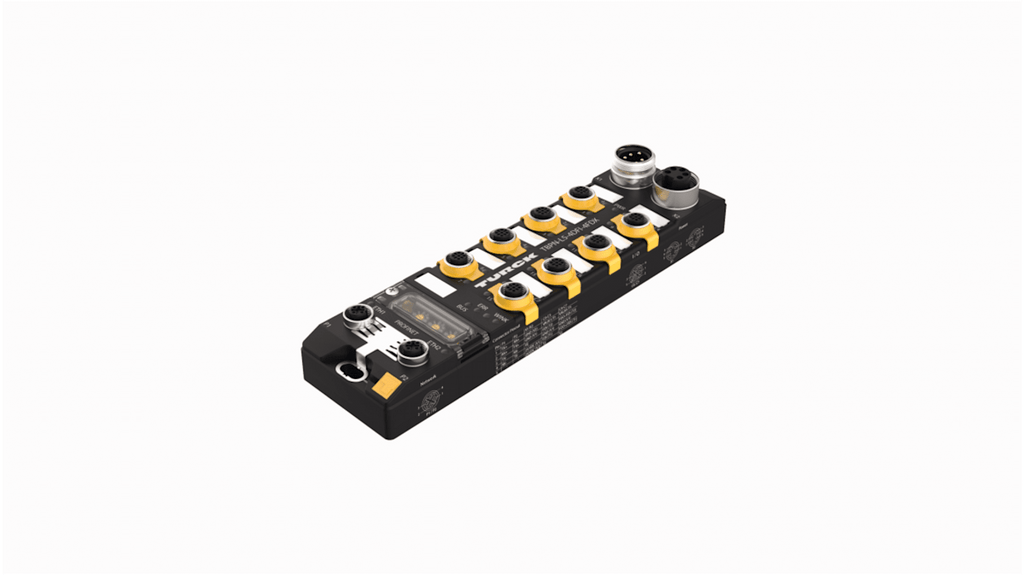 Modulo I/O Turck per applicazioni industriali, contenitore rinforzato in fibra di vetro, quattro ingressi digitali SIL3 sicuri, switch Ethernet integrato, supporto fino a 100 Mbps, testato per urti e vibrazioni, elettronica completamente incapsulata, classi di protezione IP65, IP67, IP69K. Serie TBPN.