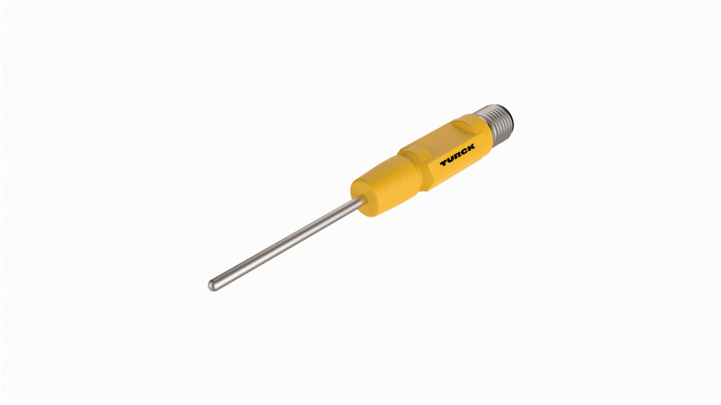 Sensore di temperatura RTD PT100, diametro 3mm, lunghezza 150mm, temperatura massima +650°C, uscita analogica 4-20 mA a 2 fili, uscita di commutazione PNP/NPN, parametrizzabile tramite IO-Link, connettore M12. Prodotto da Turck, codice costruttore TTMS-203A-CF-LIUPN-H1140-L150.